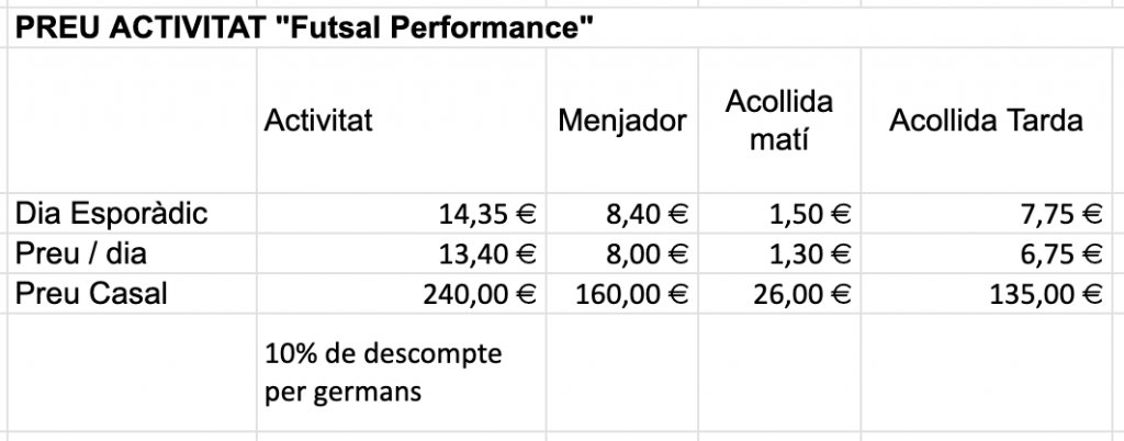 Cada dia es realitzarà tecnificació de futbol sala al Pavelló Sant Bernat, i pujarem i baixarem en autocar a mig matí per anar a la piscina diàriament.